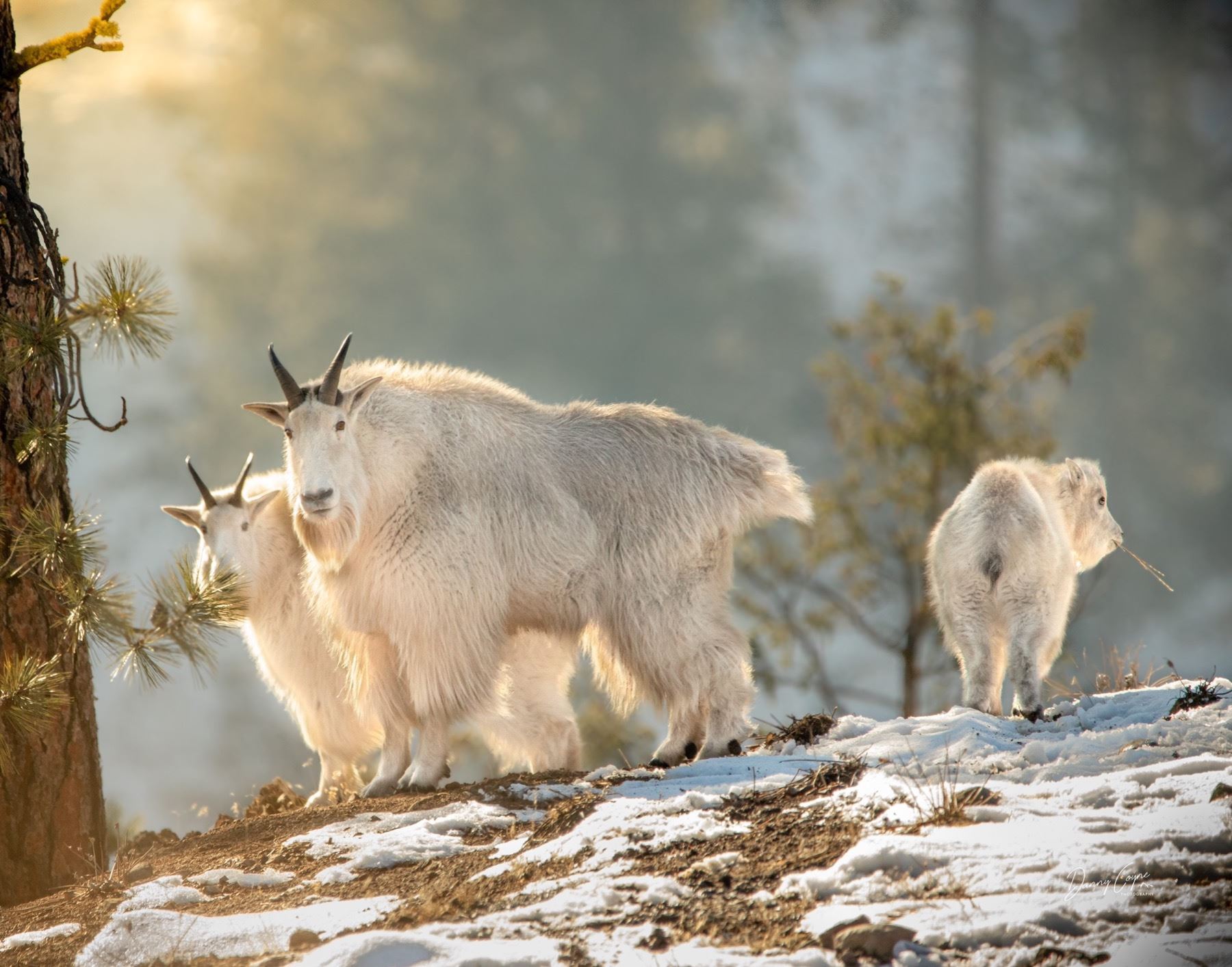 This goat picture was taken by photographer and RMGA member, Danny Coyne, in the historical Similkameen Valley near Princeton British Columbia. This small herd of less than 25 goats reside within the steep cliffs and rolling grasslands along the Similkameen River. The photo was captured during the rut on November 19, 2020. The image portrays a mature Nanny, with her kid and the herd’s dominant Billy all together as a family at sunset. A true symbol of how conservation efforts can protect and support the future of such a sensitive herd of Mountain Goats.