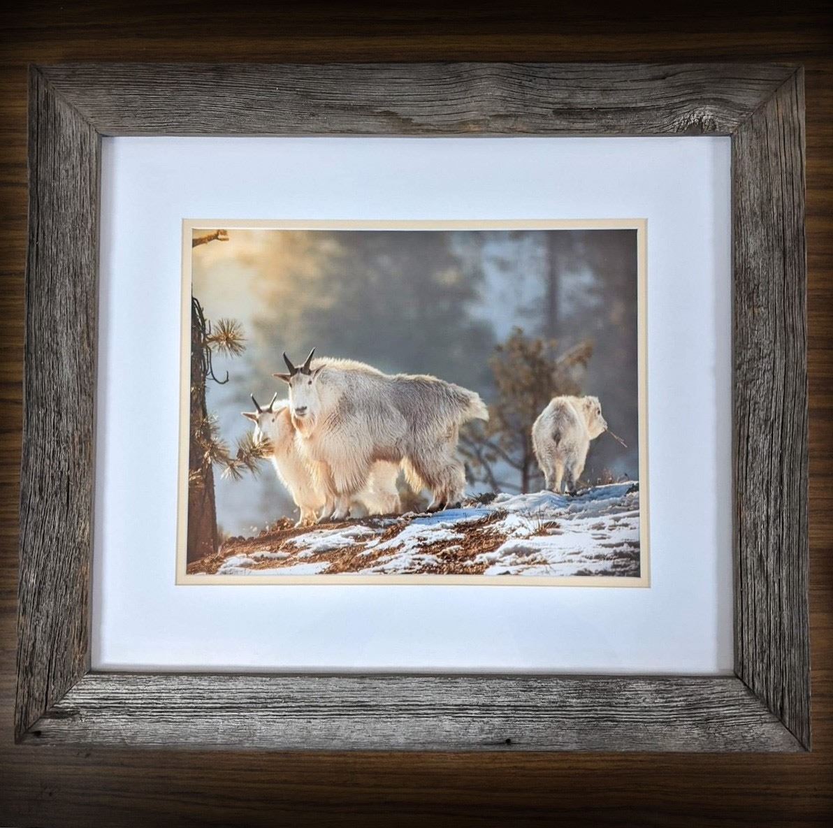 The print is an 11x14, printed with a Pearl finish. Like a matte finish but with a slight satin feel with a smooth surface that displays well in any light. The picture will be delivered with a custom-built frame made of historical barnwood from an old homestead in the Similkameen Valley, which is the same mountain drainage these goats reside in. The frame is being constructed by a local artist, Jody Woodford from the Princeton area. The finish product will display the photo with a matted border and conservation glass to protect the image from UV light for many years.
